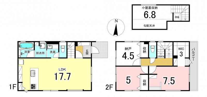 - カウンターキッチン、オール電化、ウォークインクローゼット、駐車場2台分、トイレ2箇所、納戸、小屋裏収納、庭