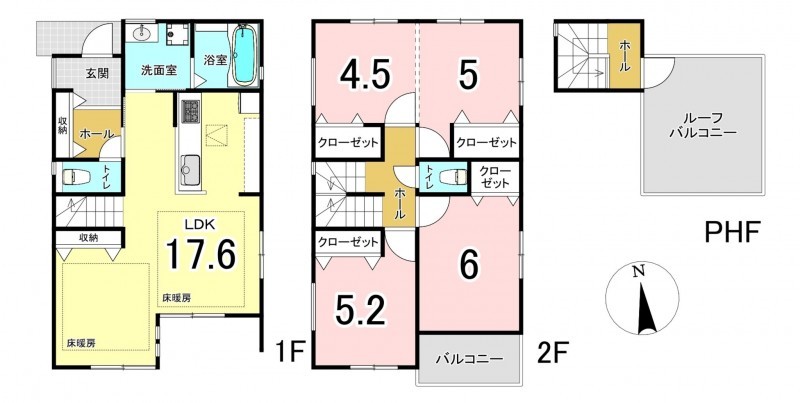 - システムキッチン、カウンターキッチン、床暖房、ルーフバルコニー、駐車場2台分、床下収納、トイレ2箇所