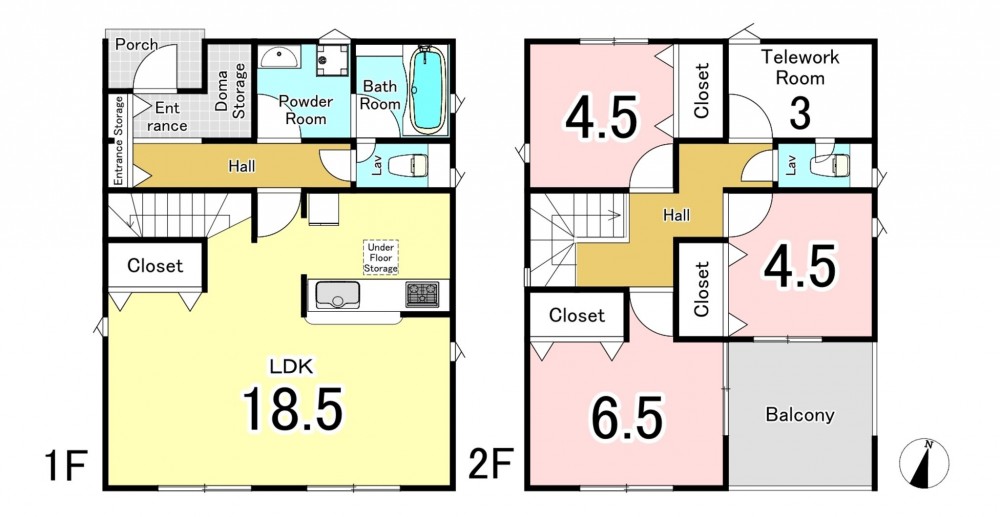 - システムキッチン、カウンターキッチン、シャンプードレッサー、洗浄便座、浴室乾燥機、複層ガラス、ルーフバルコニー、モニタ付インターホン、駐車場2台分、床下収納、トイレ2箇所、テレワークルーム、土間収納
