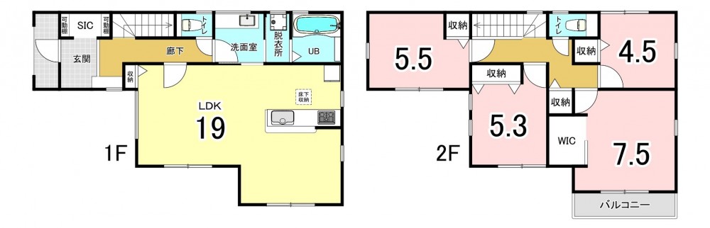 - システムキッチン、カウンターキッチン、シャンプードレッサー、洗浄便座、浴室乾燥機、複層ガラス、ウォークインクローゼット、モニタ付インターホン、駐車場2台分、床下収納、トイレ2箇所、シューズインクローゼット、庭